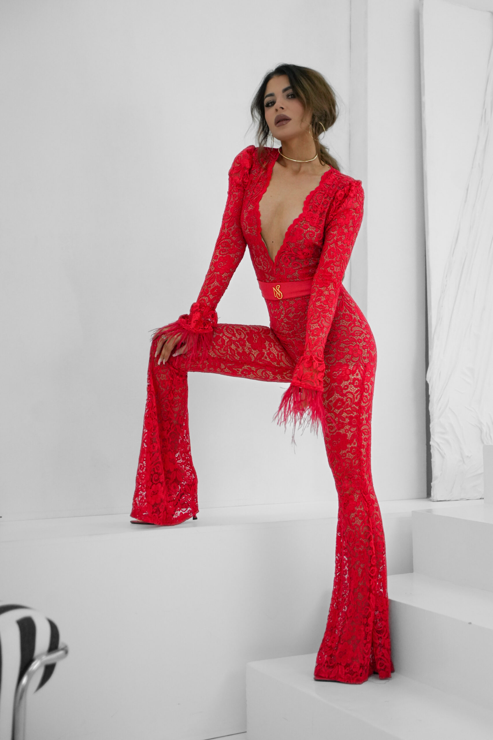 Wykonany z delikatnej koronki, zachwyca subtelnym blaskiem i wyjątkowym wykończeniem. Rękawy ozdobione piórami dodają lekkości i szyku, a całość prezentuje się niezwykle kobieco. 💫